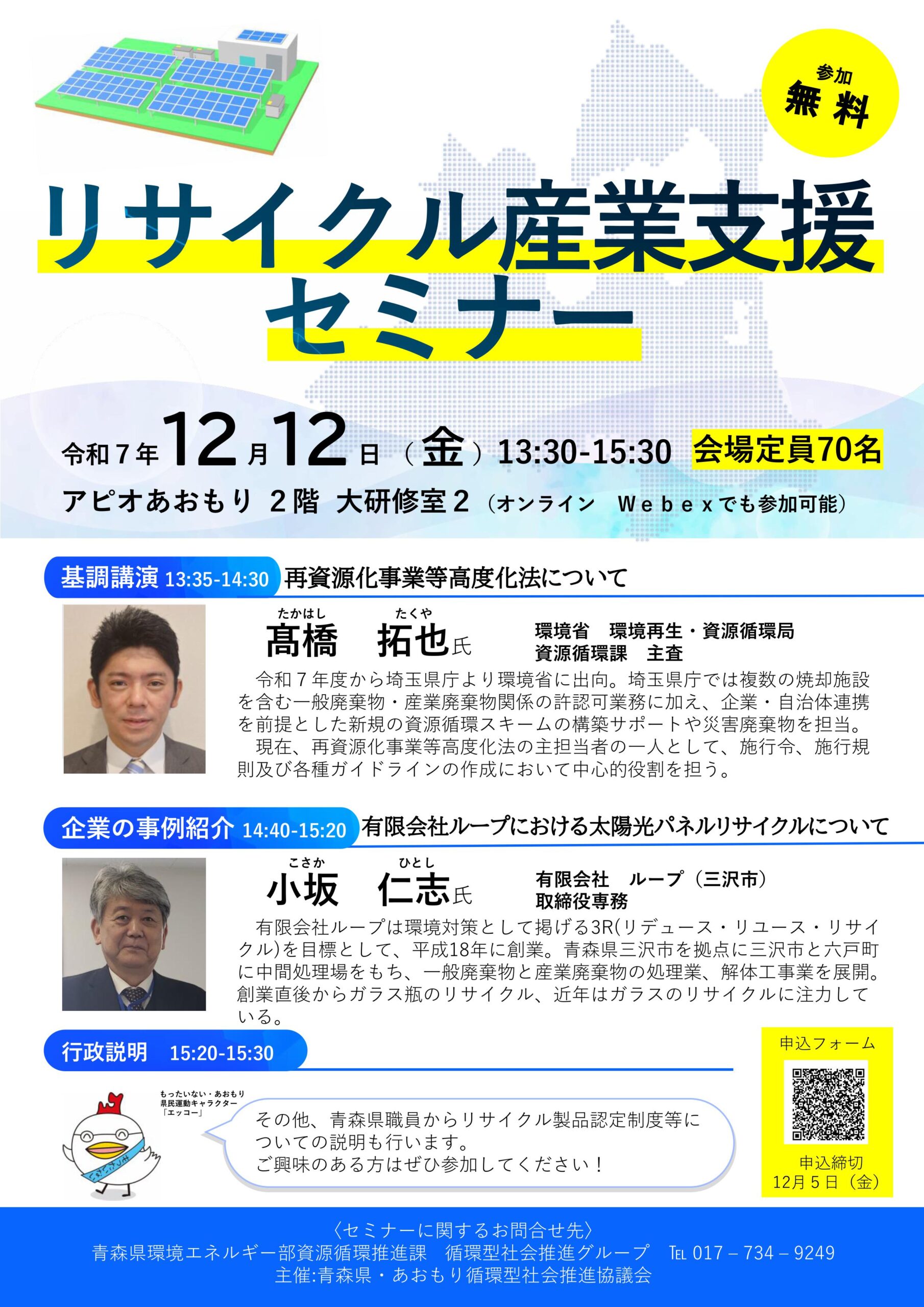このため、県民や事業者等の廃棄物適正処理を推進するとともに、リサイクル関連事業者等に対し、本県の循環・環境産業の育成・振興、市場の動向、新規製品等の開発及び販売拡大等に関する有益な情報を提供するセミナーを開催します。