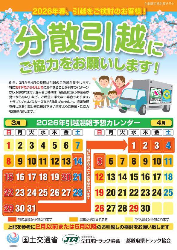 特に3月下旬から4月上旬に集中することが例年のパターンから予想されます。混み合う時期は「希望日にあう事業者がみつからない」など、ご希望に沿えない場合もあります。トラブルのないスムーズなお引越しのためにも、混雑時期を外したお引越しをご検討くださいますようご理解・ご協力をお願いいたします。