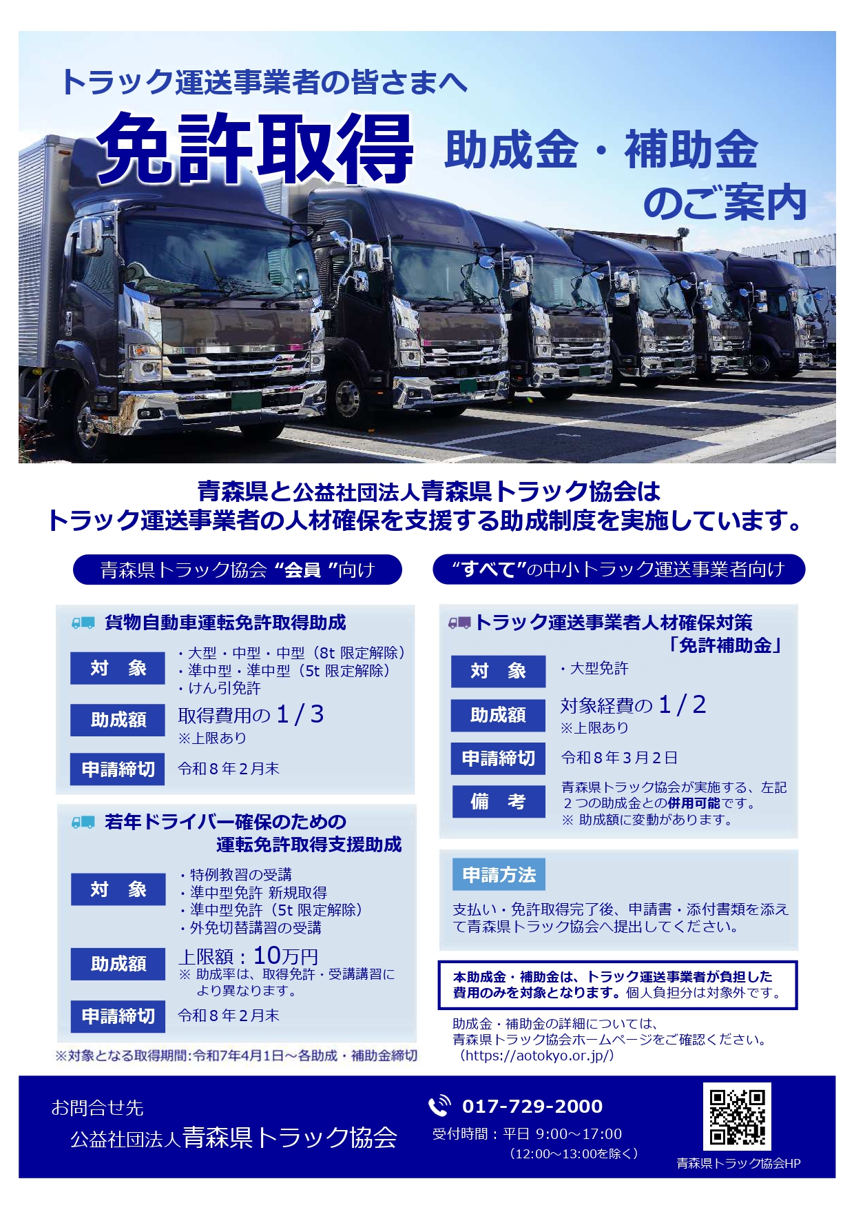 ご不明な点は、公益社団法人青森県トラック協会 業務部 免許補助金係までお問い合わせください。