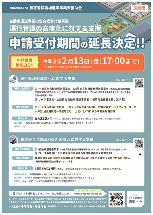「令和7年度予算 被害者保護増進等事業費補助金」※予算がなくなり次第終了 実施補助事業 (1)運行管理の高度化に対する支援 交付申請受付 令和7年7月31日(木)10:00~令和8年2月13日(金)17:00(先着順※) 【補助対象経費】